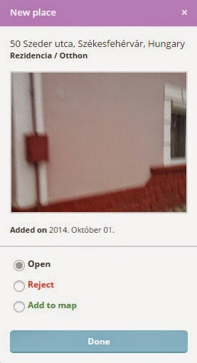 Első és legfontosabb az új hely fajtája: privát (Ez egy lakóház) vagy publikus. Ha új helyet hoztatok létre, és az nem magánház, akkor adjátok meg a nevét (az üres sávban), majd be tudjátok állítani a típusát, címét. Később lehetőségetek van megadni egyéb adatokat is, például honlap, nyitva tartási idő, stb. A privátként felvitt helyek képe akkor látszik a kliensben, ha valaki arra a címre keres rá a kliensben, a kép készítőjének neve ilyenkor nem látható.